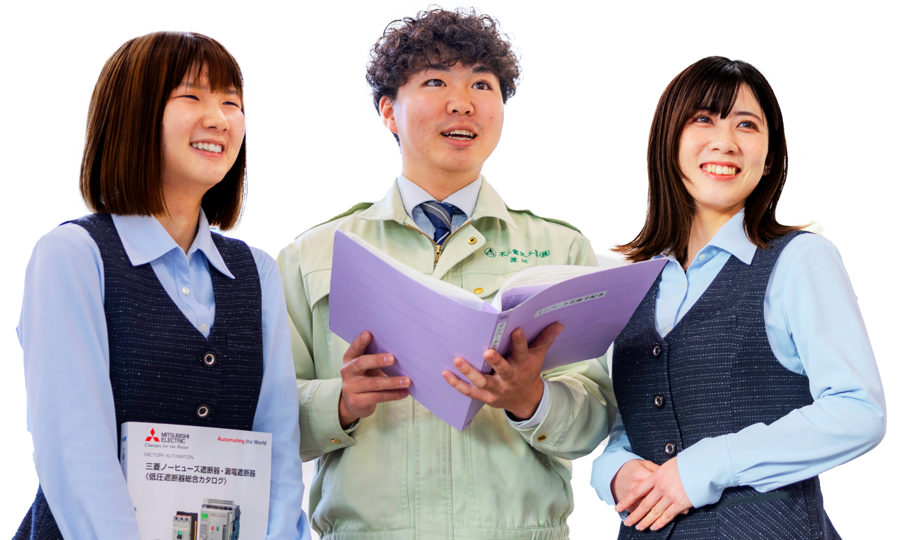 入社当初、電気の知識がゼロの状態で挑戦するため、とても不安でした。しかし、日々先輩社員から丁寧に教えていただけるほか、三菱電機主催の勉強会などで学ぶ機会も豊富にあり、働きながら着実に知識を身に付けられたため、当初の不安は見事に払拭されました。